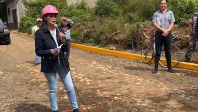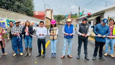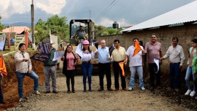 La presidenta municipal de Salvador Escalante, Araceli Saucedo Reyes, en compañía de beneficiarios y funcionarios municipales, dio formal arranque al asfaltado de una de las principales calles de la comunidad
