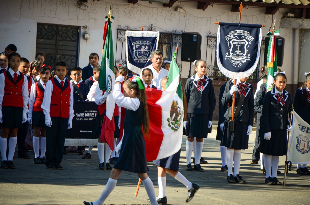 Tingambato, Mich. – Autoridades municipales, educativas, estudiantes y padres de familia, llevaron acabo el acto protocolario del día de la bandera, con alumnos de la Primaria Jaime Torres Bodet, realizaron la representación de la historia de Bandera de México.