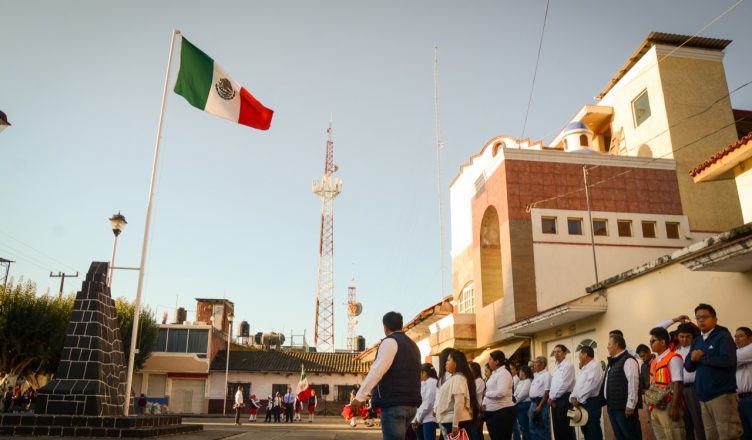 Secretario del H. Ayuntamiento; Juan Hernández Melchor, Tesorero y funcionarios del Ayuntamiento y la banda de guerra de la Primaria Jaime Torees Bodet, turno matutito, llevaron acabo el izamiento de la bandera desde el balcón de la Presidencia Municipal.
