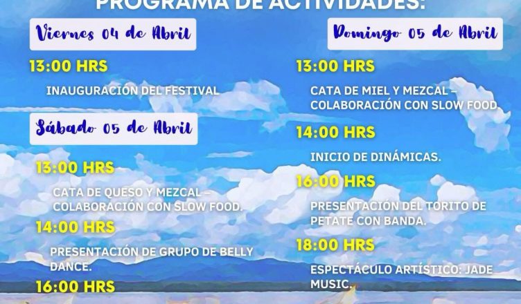 Rebeca Castro Alonso, cocinera tradicional michoacana recordó que la inauguración se realizará este viernes 4 a las 13:00 horas, mientras que el sábado 5 a las 13:00 horas se realizará la cata de queso y mezcal, siguiendo las actividades a las 14:00 horas con una presentación de danza del vientre, para continuar con el Ballet Folclórico Petatzécuaro. Toda la programación puede ser consultada en el Facebook de la Sectur Michoacán.