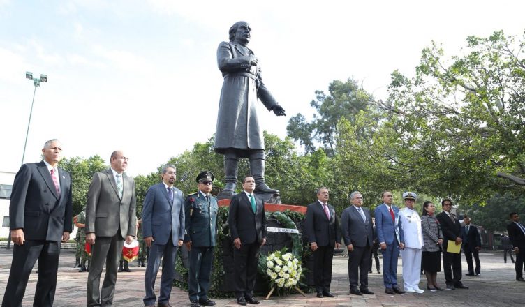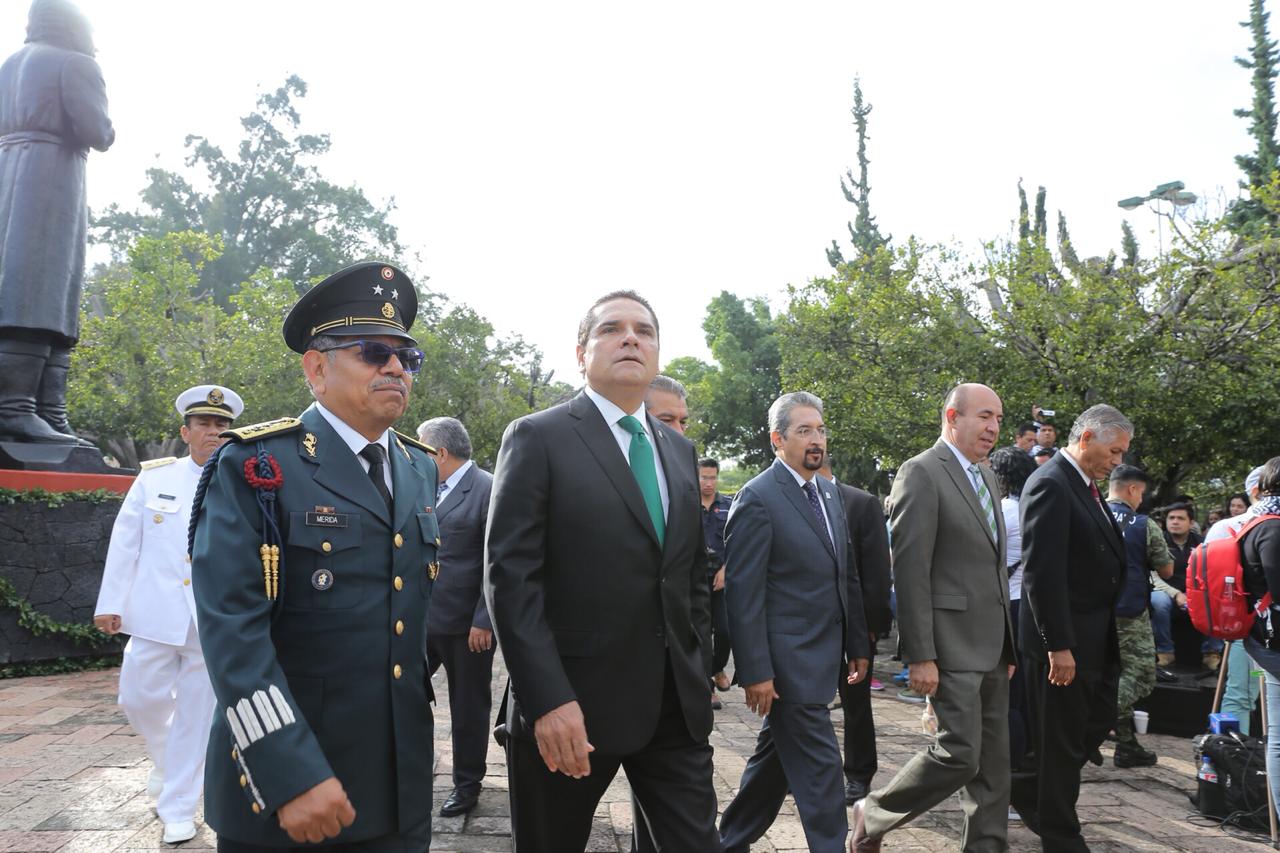 Acompañado del secretario de Gobierno, Pascual Sigala Páez; el presidente municipal de Morelia, Raúl Morón Orozco; integrantes de la Junta; autoridades municipales, estatales y federales, colocaron también la ofrenda floral en el Jardín Hidalgo y montaron guardia de honor.