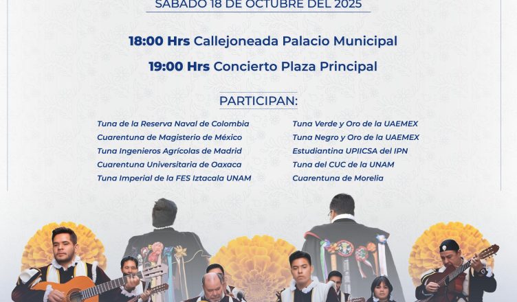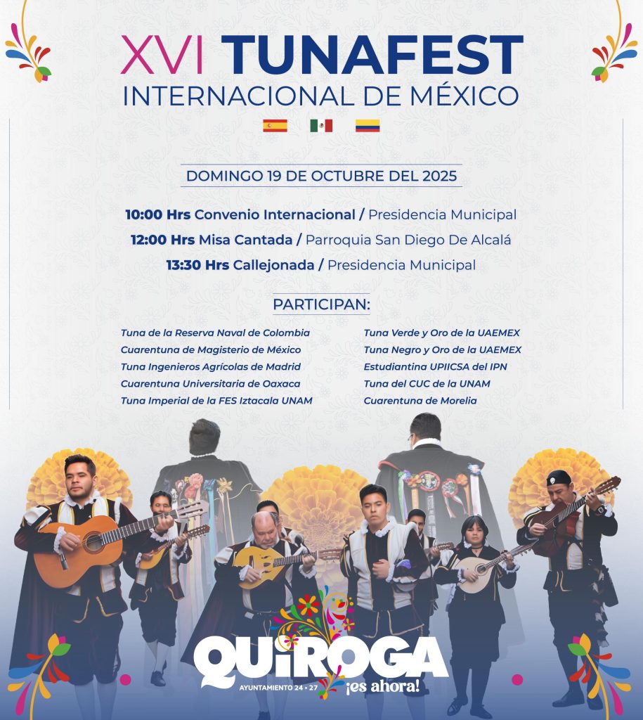 La música, la alegría y la tradición volverán a llenar las calles de Quiroga con la realización del XVI TunaFest Internacional de México, que se llevará a cabo los días 18 y 19 de octubre, reuniendo a tunas nacionales e internacionales en un encuentro lleno de color, ritmo y hermandad.
