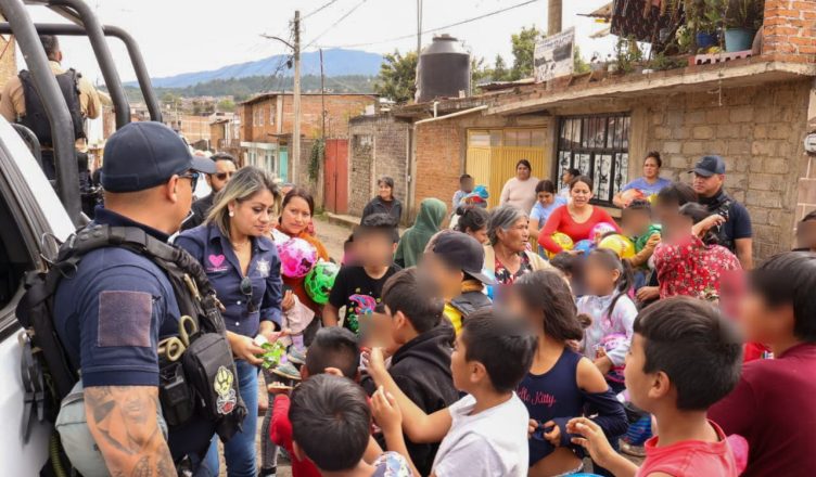 Pátzcuaro, Michoacán a 7 de enero de 2025.- Elementos de Seguridad Pública Municipal llevaron sonrisas y regalos a las niñas y niños de las colonias aledañas en una emotiva jornada llena de solidaridad y alegría.