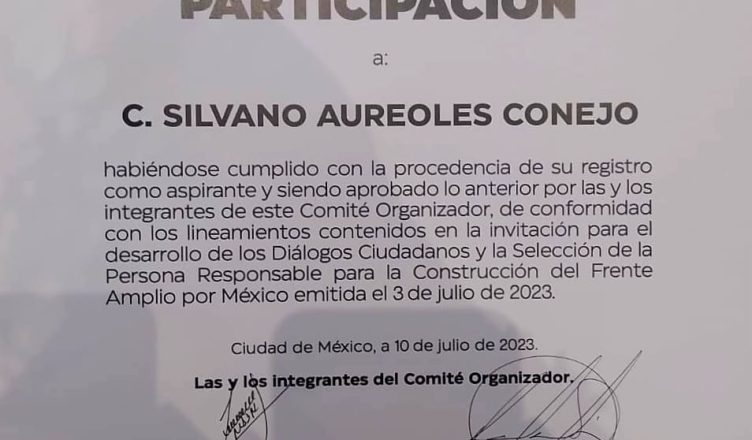 En la conferencia que dio por parte de las y los integrantes del Comité Organizador del Frente, Silvano Aureoles fue el primero en ser nombrado, para después entregarle una constancia a su representante, con lo cual se acredita la participación del exgobernador de Michoacán. En la constancia que se le entregó se lee que: “habiéndose cumplido con la procedencia de su registro como aspirante y siendo probado lo anterior por los y las integrantes de este comité organizador”.